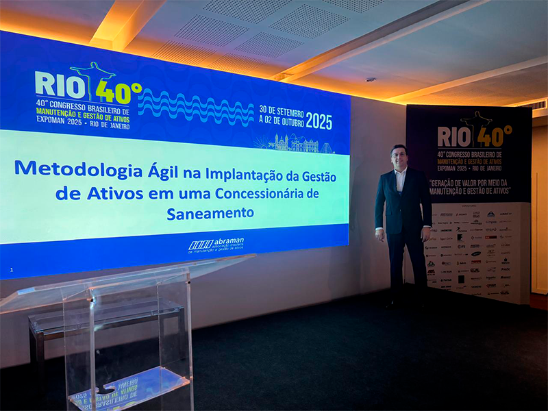 O diretor da concessionária, Marcelo Matos, acompanhado do coordenador de controle de operação, Jorge Loffi, apresentou a palestra “Metodologia ágil na implementação de gestão de ativos em uma concessionária de saneamento”, na qual compartilhou a experiência da empresa na adoção de práticas que otimizam processos, elevam a eficiência operacional e fortalecem a sustentabilidade dos serviços prestados.