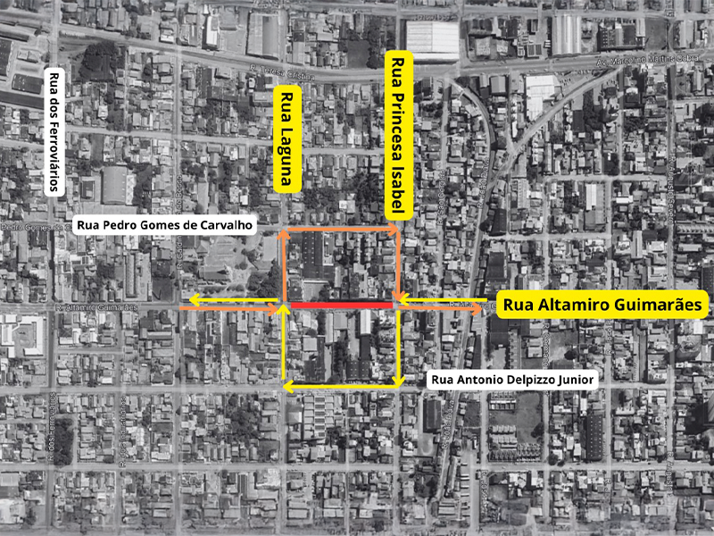 Já para quem segue no sentido Centro–bairro Oficinas, o desvio poderá ser feito pelas ruas Princesa Isabel, Antônio Delpizzo Junior e Laguna, retornando à Rua Altamiro Guimarães.